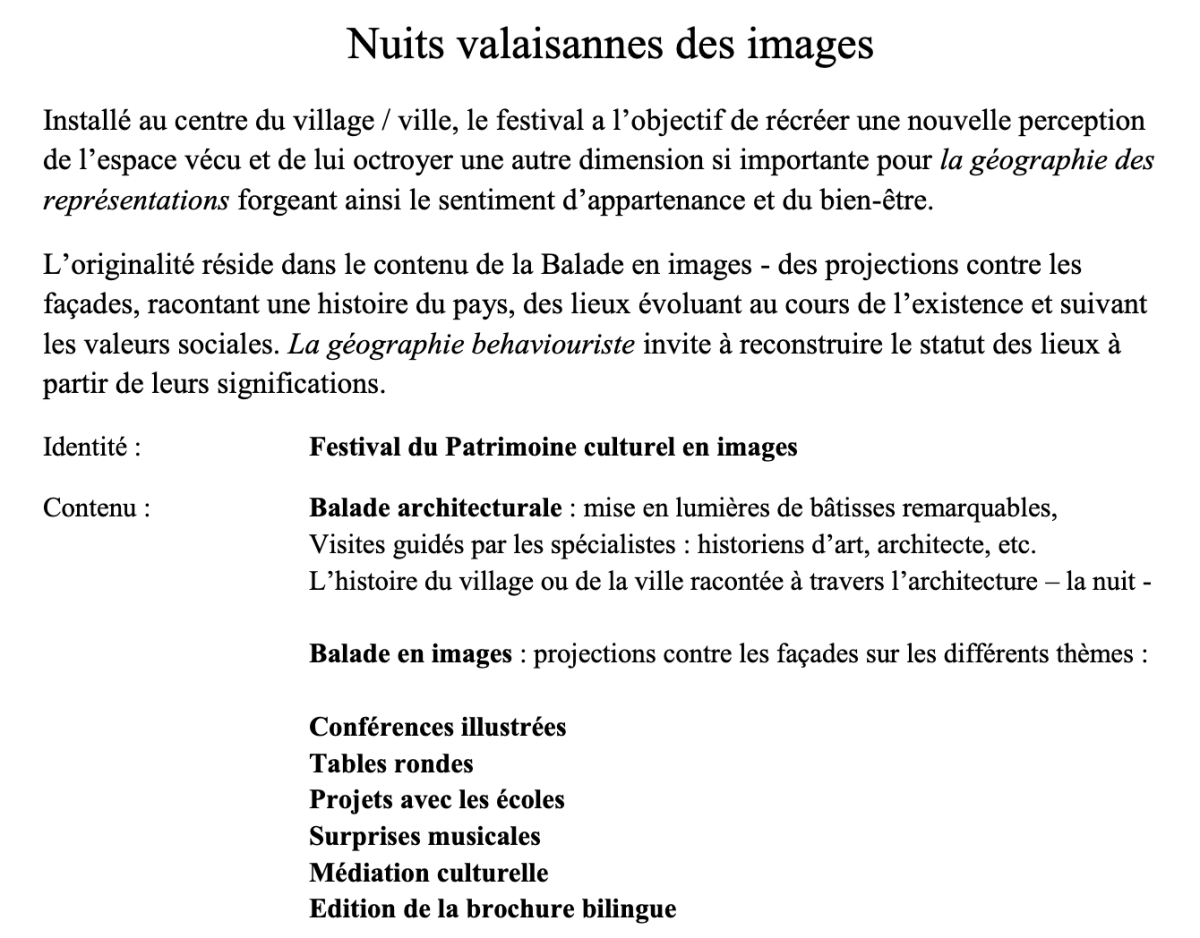 Désormais, la Fondation Edelweiss a passé le relais du festival Nuits Valaisannes des Images à la Médiathèque Valais - Martigny qui reprend le nom du festival. Nous nous réjouissons de découvrir leur nouveau concept.